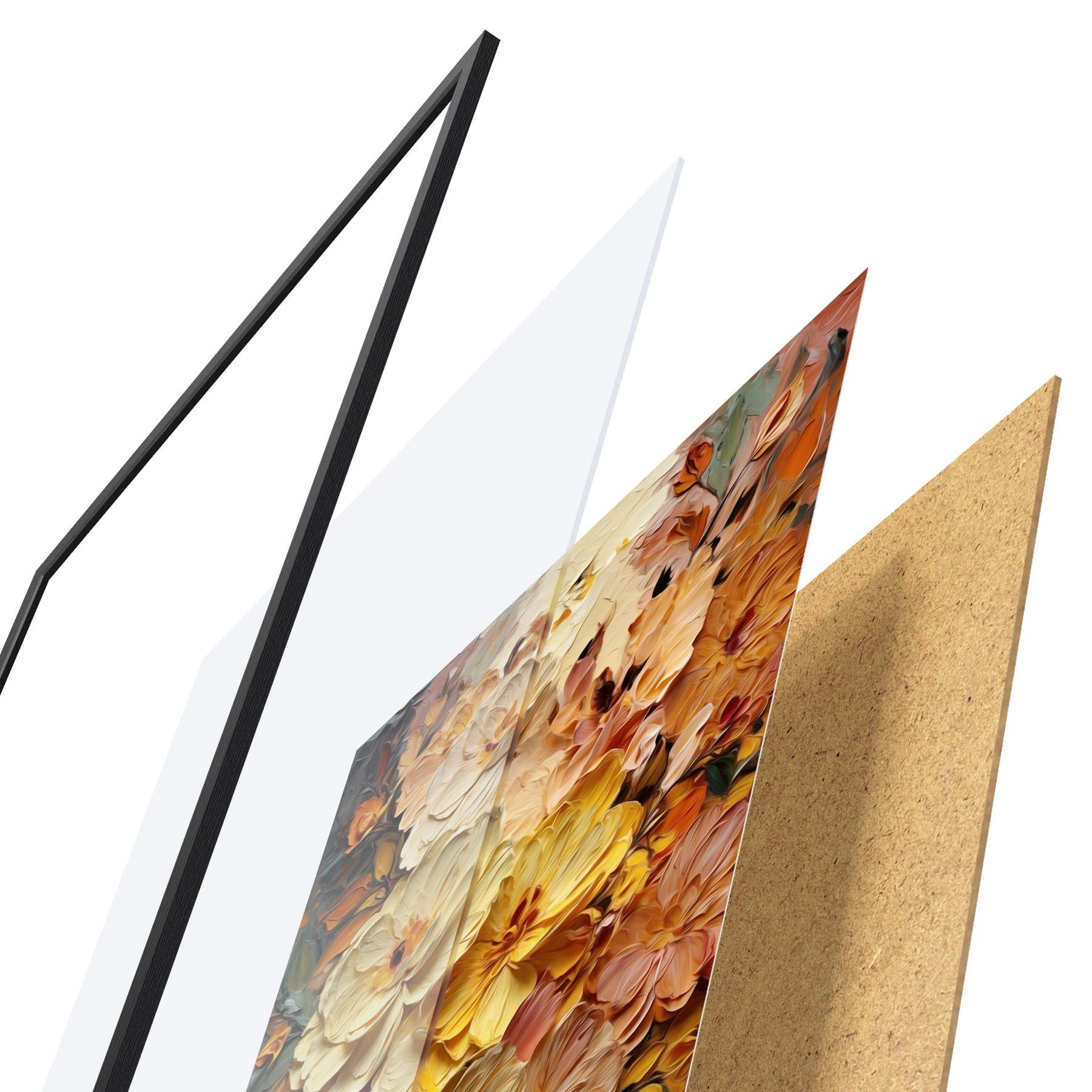 Das Poster besteht aus einem Rahmen, Plexiglas, einem gedruckten Bild und einer Rückwand aus Spanplatten. Dank der Halterungen auf der Rückseite kann das Poster sofort an die Wand gehängt werden.