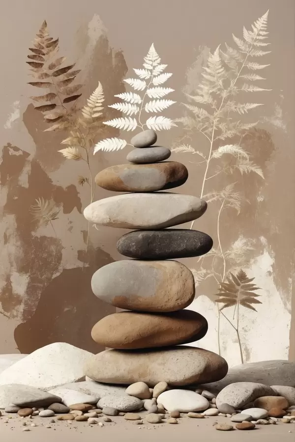 Poster Stapel glatter Steine vor botanischem Hintergrund f47764