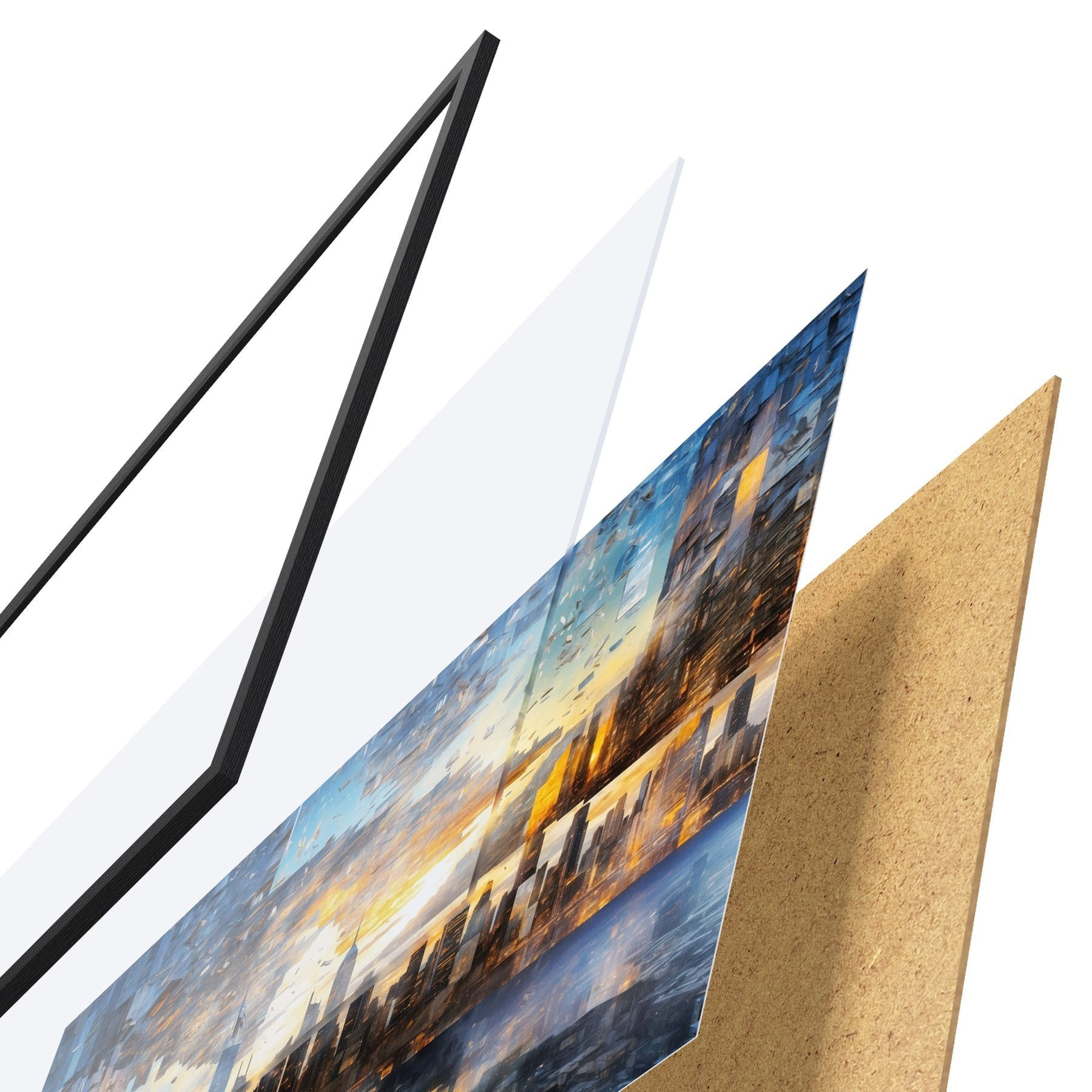 Das Poster besteht aus einem Rahmen, Plexiglas, einem gedruckten Bild und einer Rückwand aus Spanplatten. Dank der Halterungen auf der Rückseite kann das Poster sofort an die Wand gehängt werden.