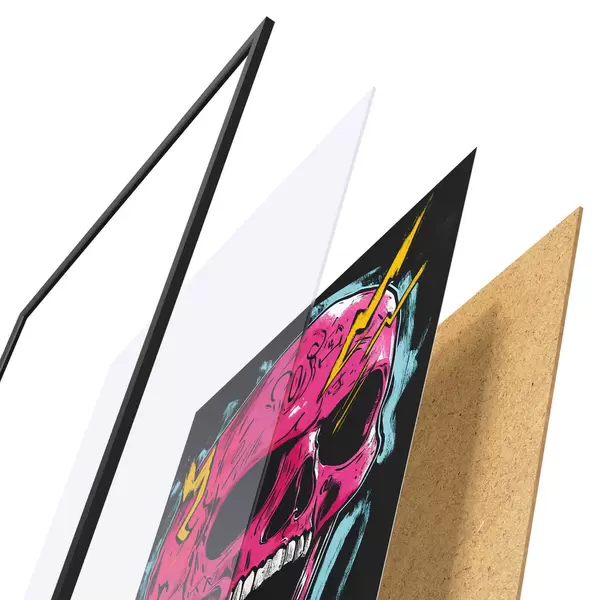 Das Poster besteht aus einem Rahmen, Plexiglas, einem gedruckten Bild und einer Rückwand aus Spanplatten. Dank der Halterungen auf der Rückseite kann das Poster sofort an die Wand gehängt werden.