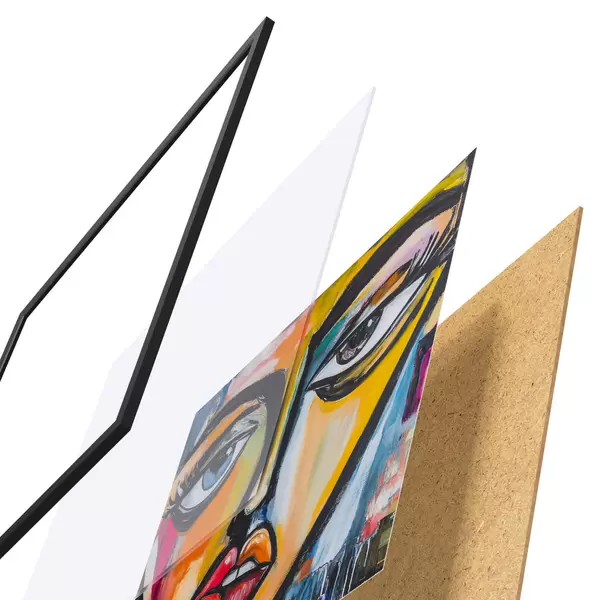 Das Poster besteht aus einem Rahmen, Plexiglas, einem gedruckten Bild und einer Rückwand aus Spanplatten. Dank der Halterungen auf der Rückseite kann das Poster sofort an die Wand gehängt werden.