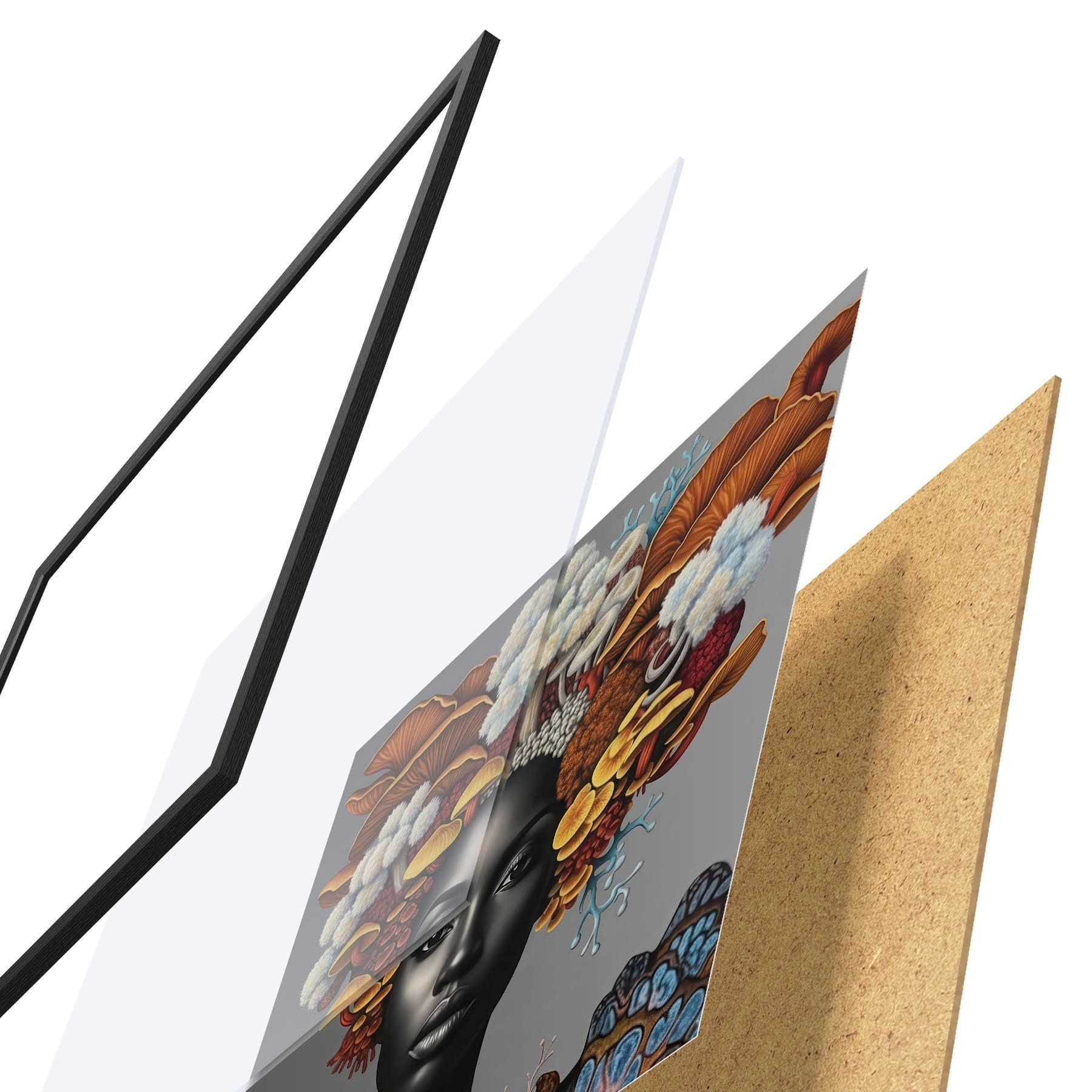Das Poster besteht aus einem Rahmen, Plexiglas, einem gedruckten Bild und einer Rückwand aus Spanplatten. Dank der Halterungen auf der Rückseite kann das Poster sofort an die Wand gehängt werden.