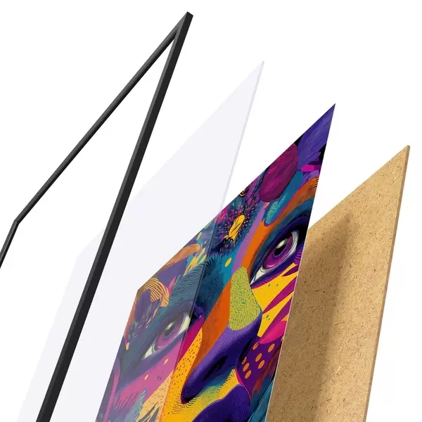 Das Poster besteht aus einem Rahmen, Plexiglas, einem gedruckten Bild und einer Rückwand aus Spanplatten. Dank der Halterungen auf der Rückseite kann das Poster sofort an die Wand gehängt werden.