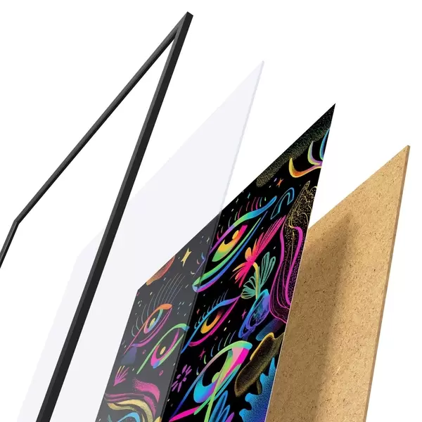 Das Poster besteht aus einem Rahmen, Plexiglas, einem gedruckten Bild und einer Rückwand aus Spanplatten. Dank der Halterungen auf der Rückseite kann das Poster sofort an die Wand gehängt werden.