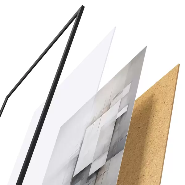 Das Poster besteht aus einem Rahmen, Plexiglas, einem gedruckten Bild und einer Rückwand aus Spanplatten. Dank der Halterungen auf der Rückseite kann das Poster sofort an die Wand gehängt werden.