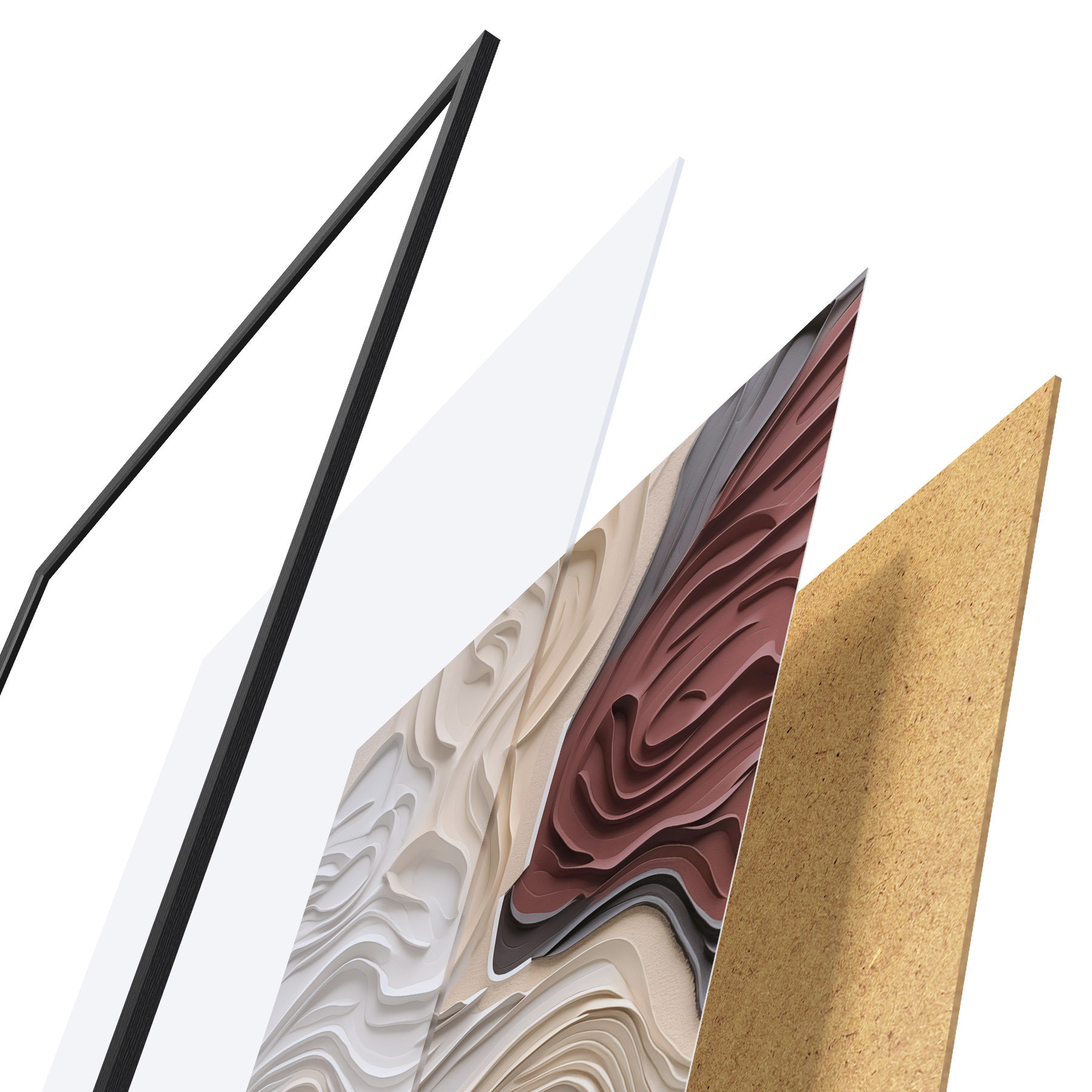Das Poster besteht aus einem Rahmen, Plexiglas, einem gedruckten Bild und einer Rückwand aus Spanplatten. Dank der Halterungen auf der Rückseite kann das Poster sofort an die Wand gehängt werden.