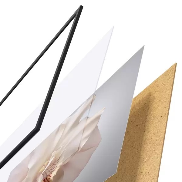 Das Poster besteht aus einem Rahmen, Plexiglas, einem gedruckten Bild und einer Rückwand aus Spanplatten. Dank der Halterungen auf der Rückseite kann das Poster sofort an die Wand gehängt werden.
