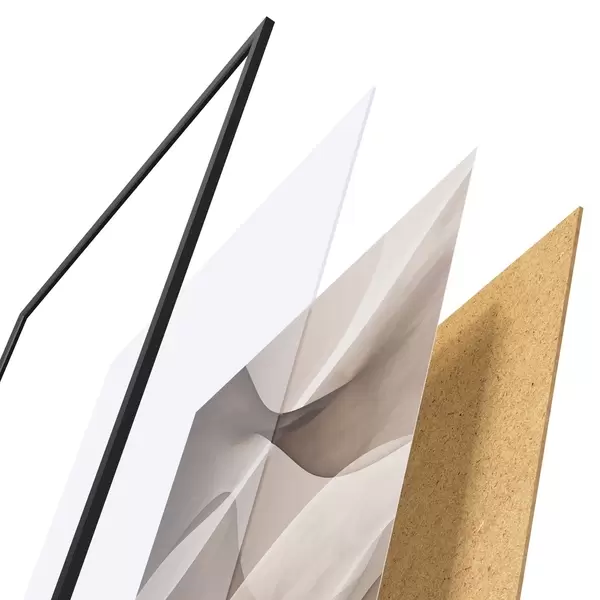 Das Poster besteht aus einem Rahmen, Plexiglas, einem gedruckten Bild und einer Rückwand aus Spanplatten. Dank der Halterungen auf der Rückseite kann das Poster sofort an die Wand gehängt werden.