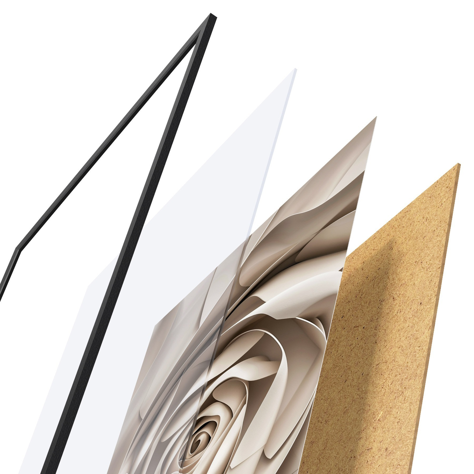 Das Poster besteht aus einem Rahmen, Plexiglas, einem gedruckten Bild und einer Rückwand aus Spanplatten. Dank der Halterungen auf der Rückseite kann das Poster sofort an die Wand gehängt werden.