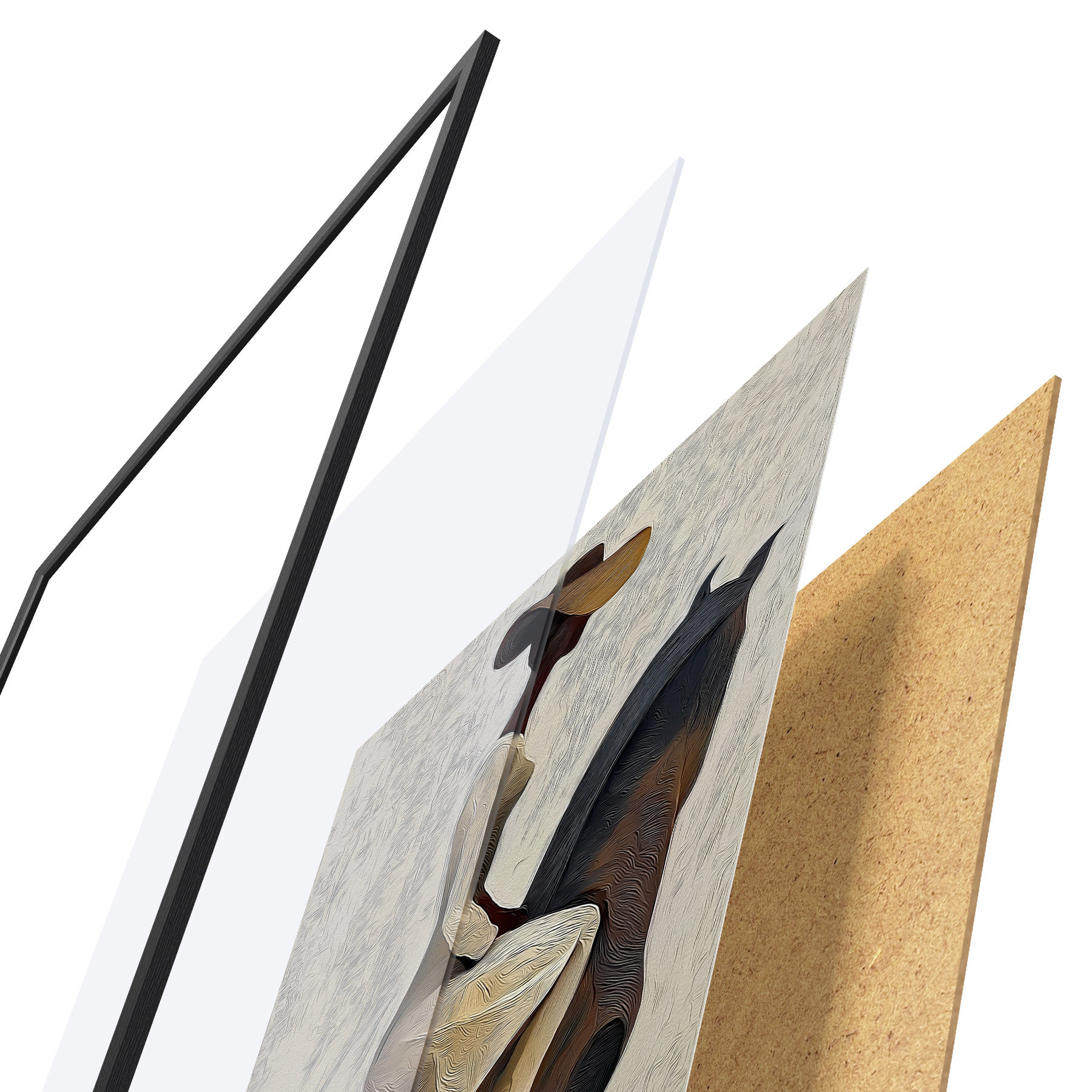 Das Poster besteht aus einem Rahmen, Plexiglas, einem gedruckten Bild und einer Rückwand aus Spanplatten. Dank der Halterungen auf der Rückseite kann das Poster sofort an die Wand gehängt werden.