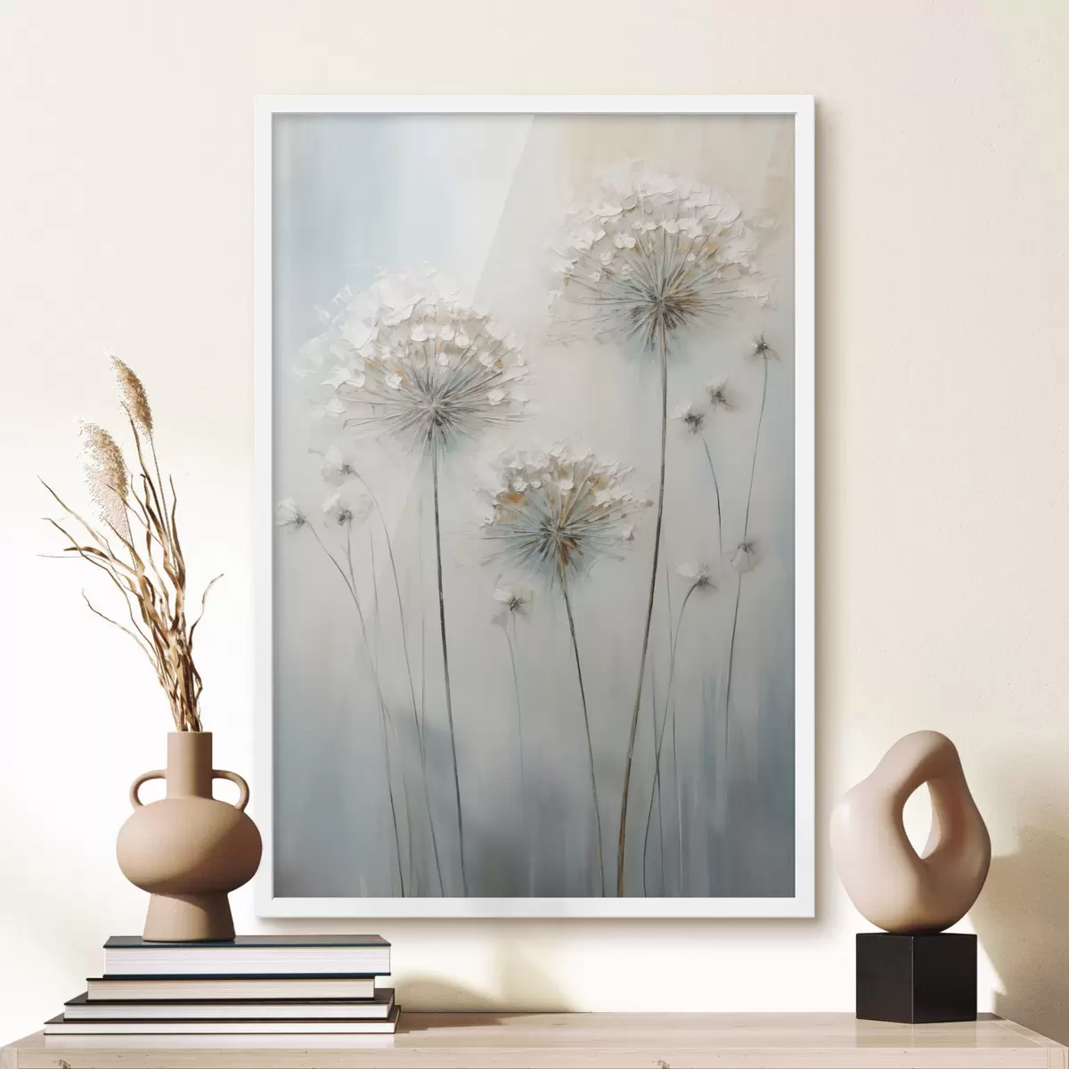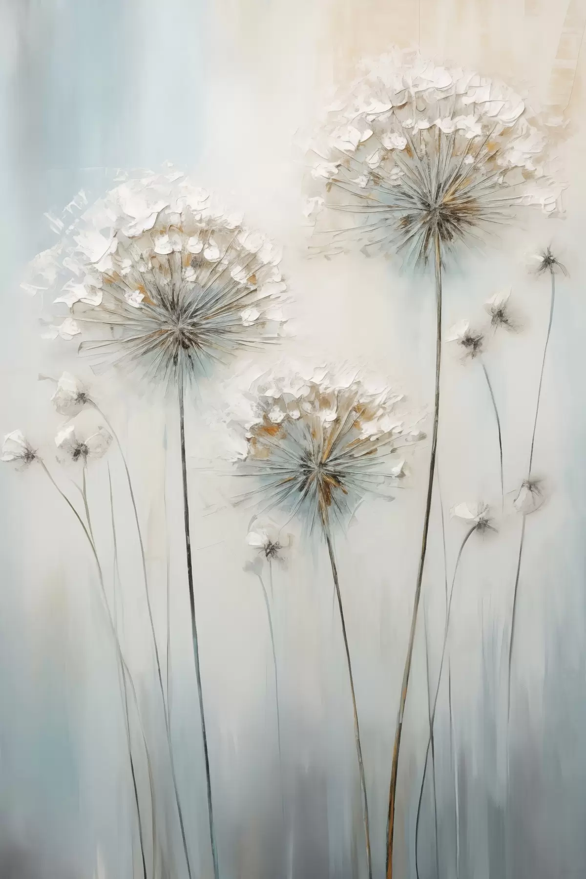 Poster Strukturierter Malstil von Löwenzahn vor einem sanften blau-weißen Hintergrund Nr f47855