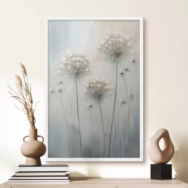 Poster Strukturierter Malstil von Löwenzahn vor einem sanften blau-weißen Hintergrund f47855