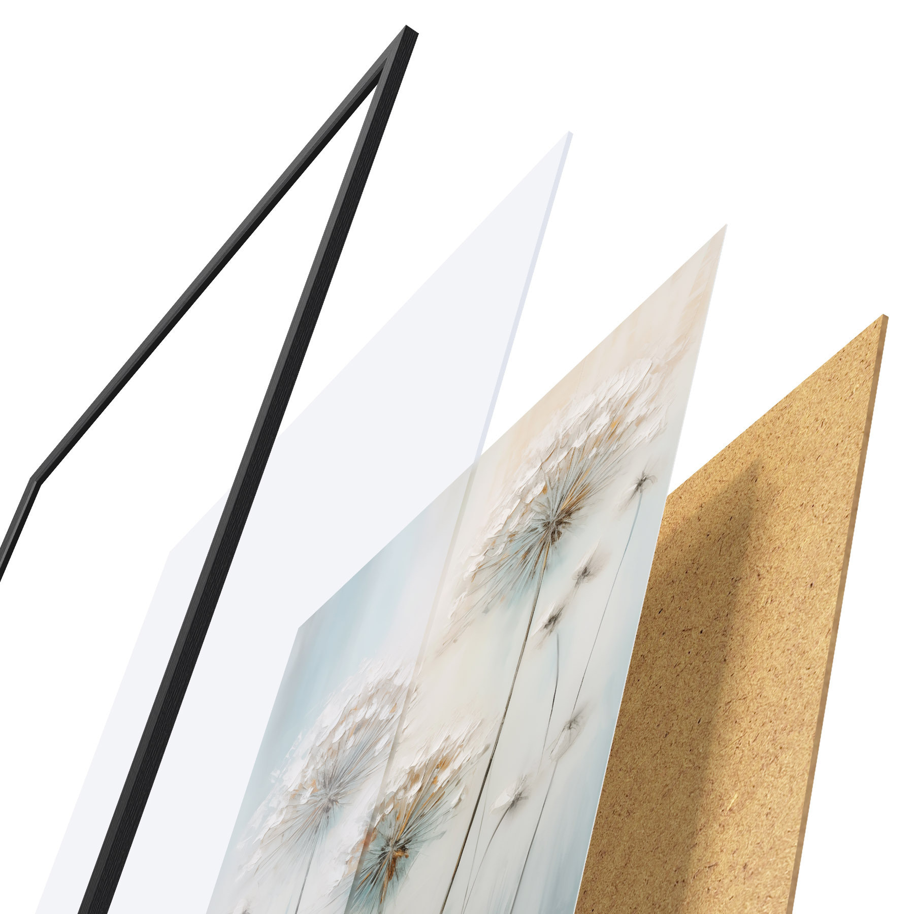 Das Poster besteht aus einem Rahmen, Plexiglas, einem gedruckten Bild und einer Rückwand aus Spanplatten. Dank der Halterungen auf der Rückseite kann das Poster sofort an die Wand gehängt werden.