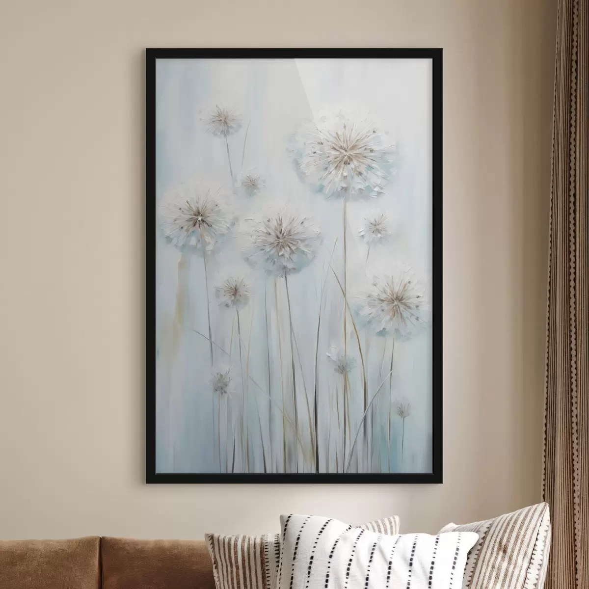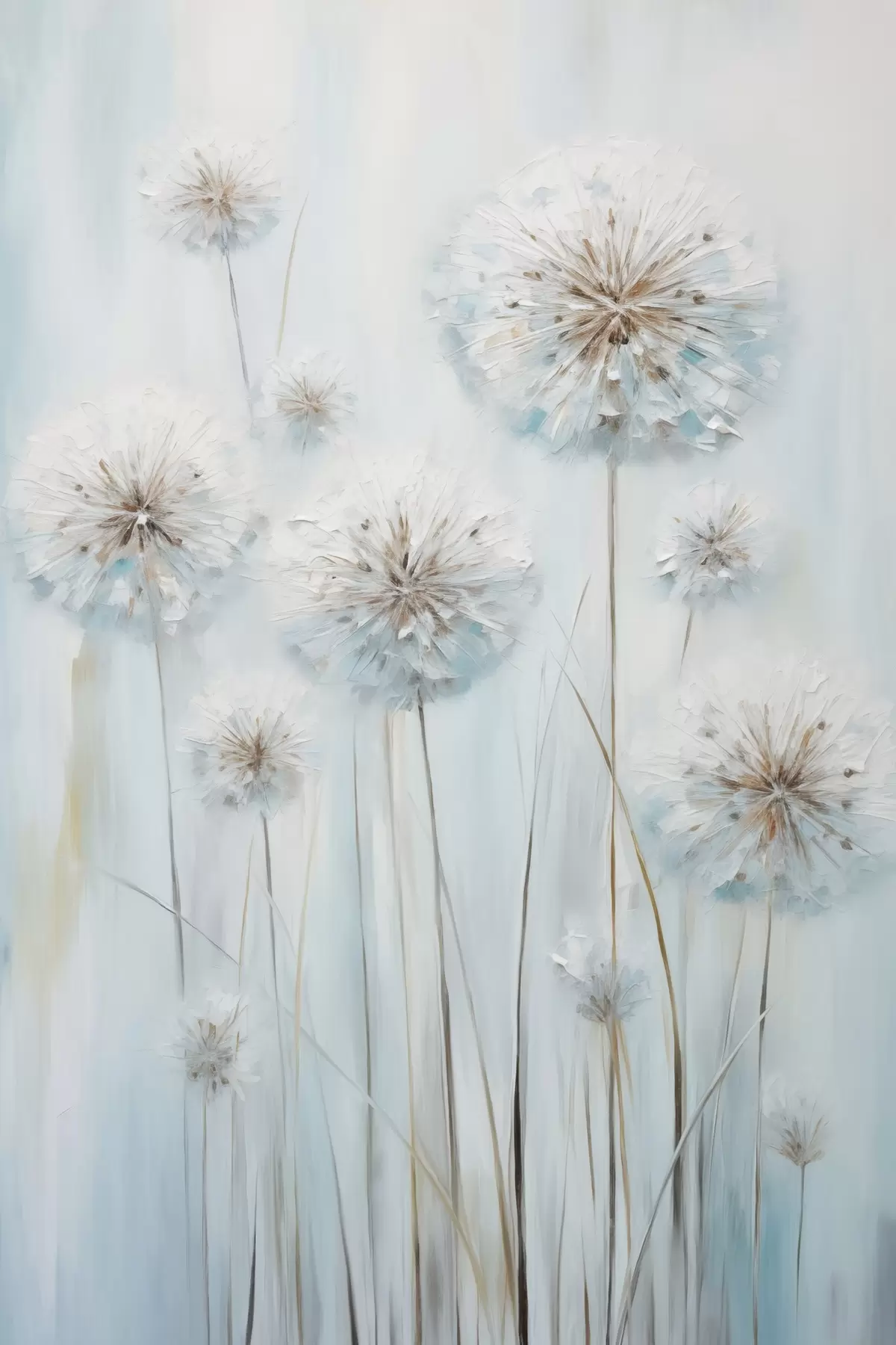 Poster Strukturierter Malstil von Löwenzahn vor einem sanften blau-weißen Hintergrund Nr f47856