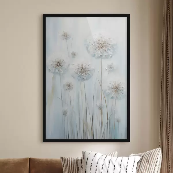 Poster Strukturierter Malstil von Löwenzahn vor einem sanften blau-weißen Hintergrund f47856