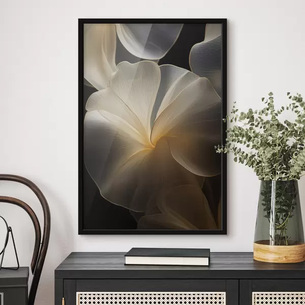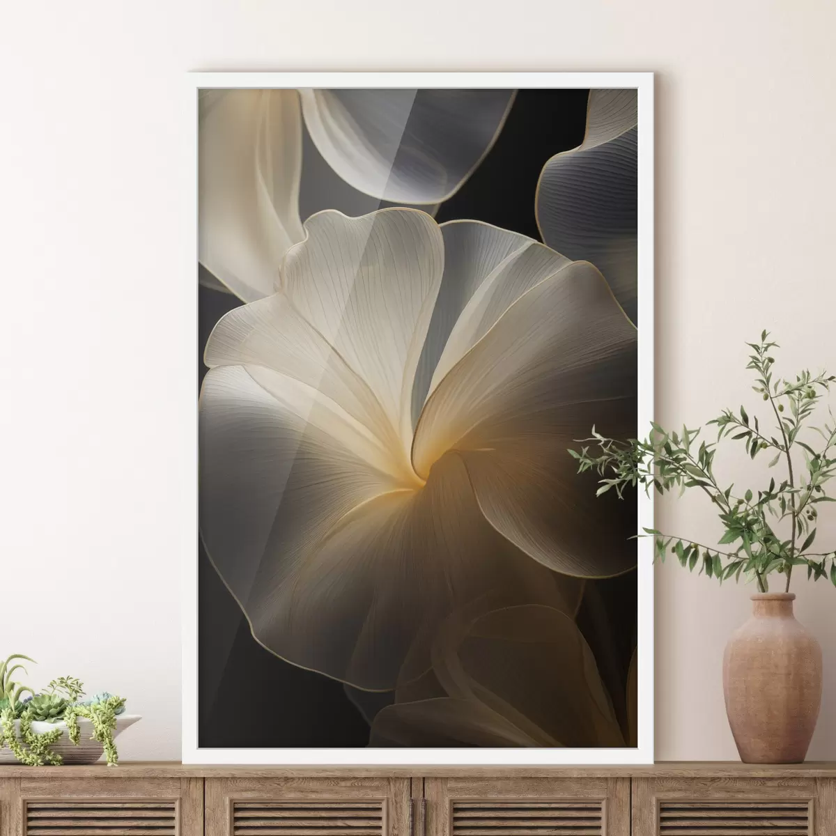 Poster Abstrakte, fließende, durchscheinende Blütenblätter mit zarten Linien vor einem dunklen Hintergrund f47860