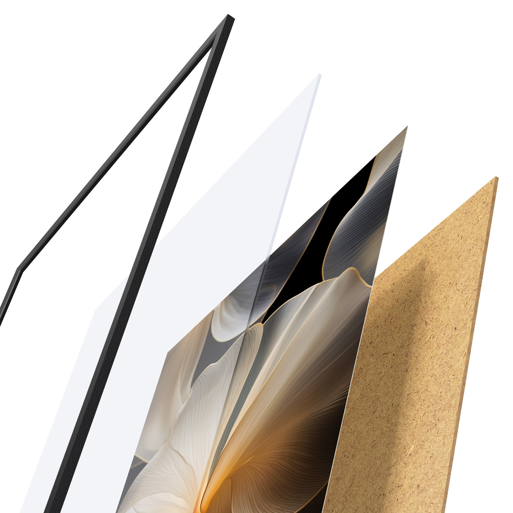 Das Poster besteht aus einem Rahmen, Plexiglas, einem gedruckten Bild und einer Rückwand aus Spanplatten. Dank der Halterungen auf der Rückseite kann das Poster sofort an die Wand gehängt werden.