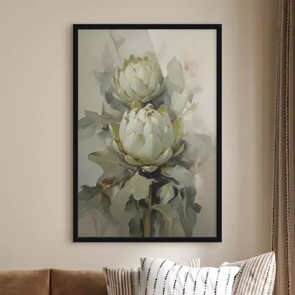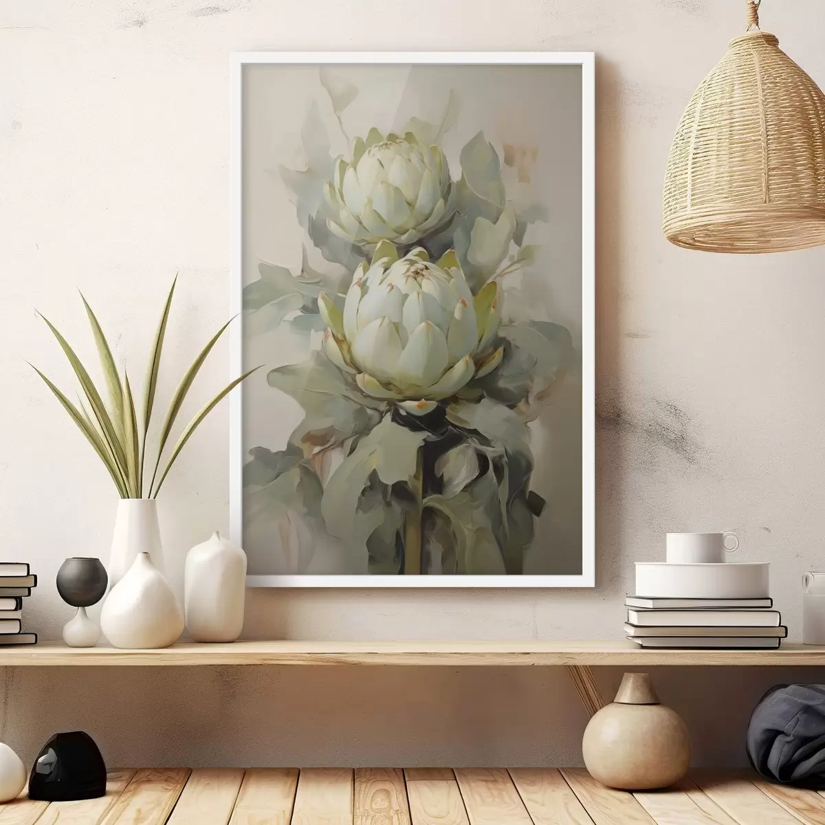 Poster Malstil mehrerer weißer Protea-Blüten mit großen grünen Blättern vor hellem Hintergrund Nr f47862