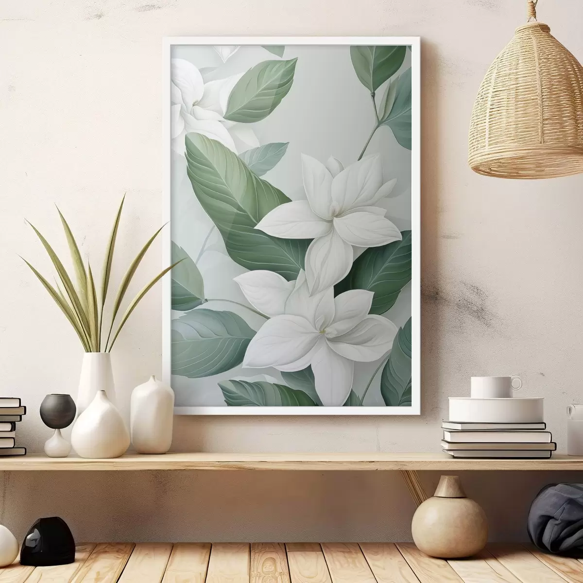 Poster Weiße Blumen mit grünen Blättern, pastellfarbener Hintergrund Nr f47869