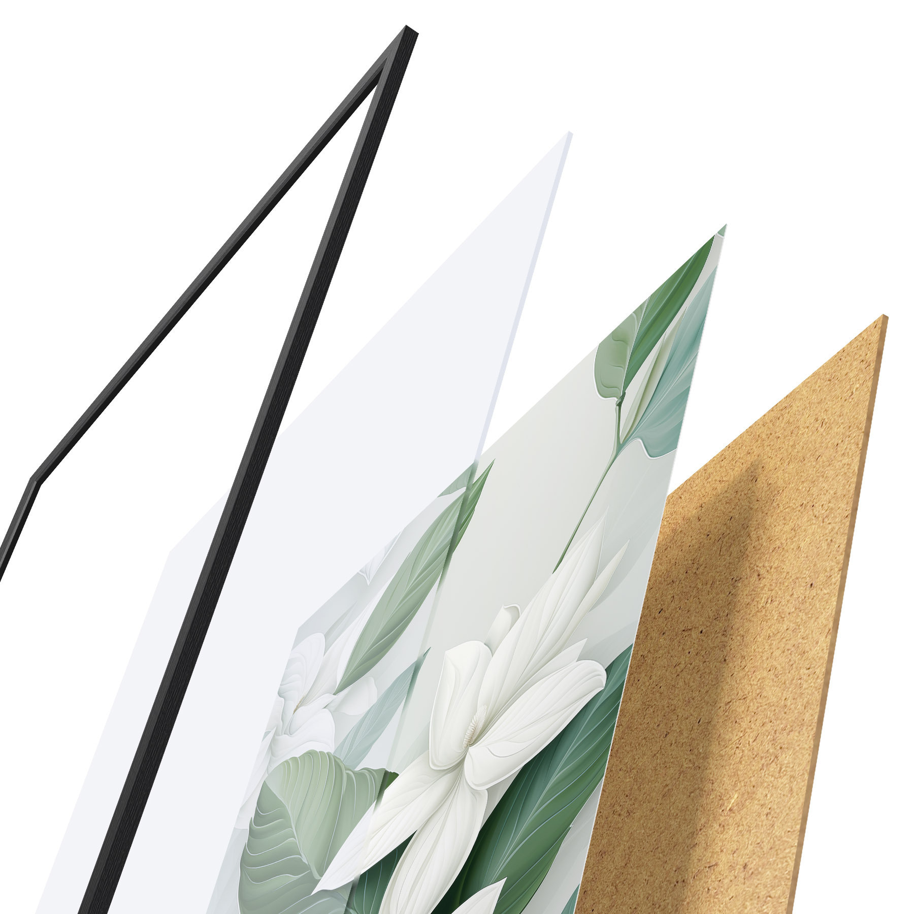 Das Poster besteht aus einem Rahmen, Plexiglas, einem gedruckten Bild und einer Rückwand aus Spanplatten. Dank der Halterungen auf der Rückseite kann das Poster sofort an die Wand gehängt werden.