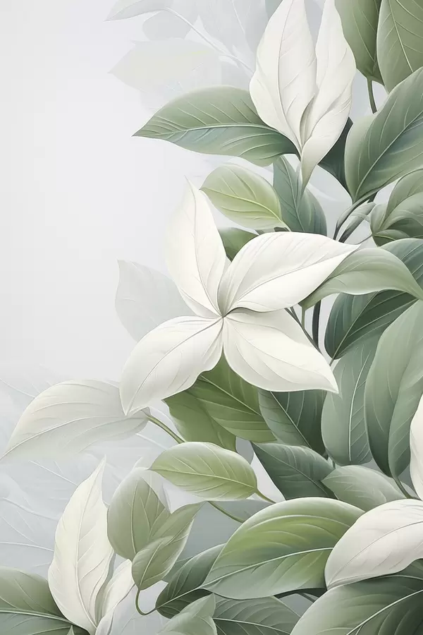 Poster Weiße Blumen mit grünen Blättern, pastellfarbener Hintergrund Nr f47870