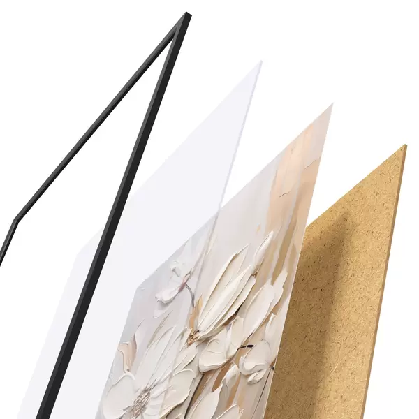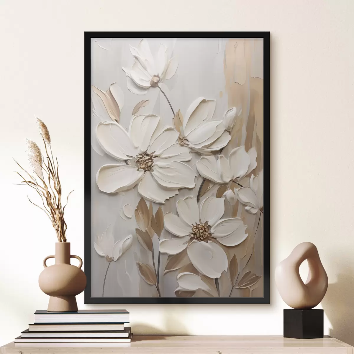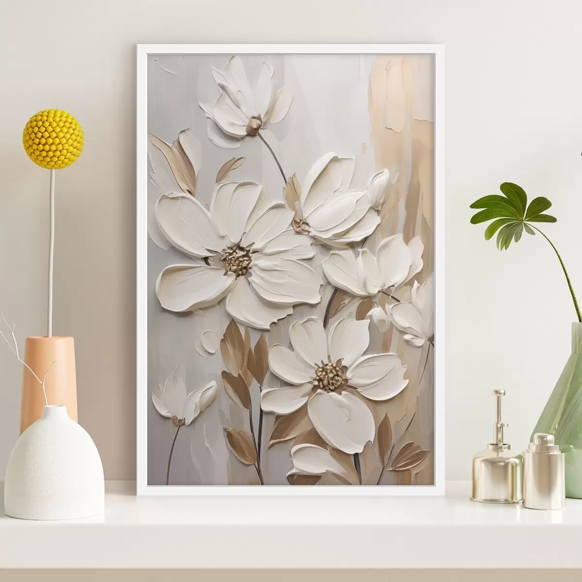 Poster Abstrakte weiße Blumen mit strukturierten Blütenblättern vor einem neutralen Hintergrund mit subtilen Pinselstrichen. f47873