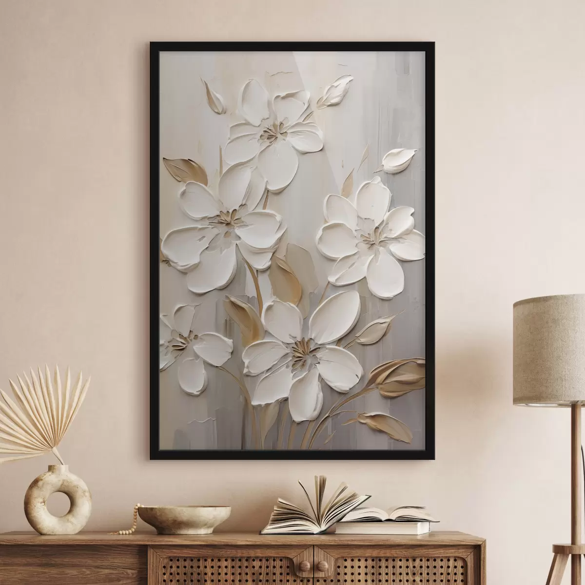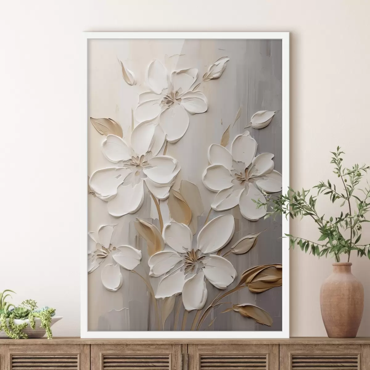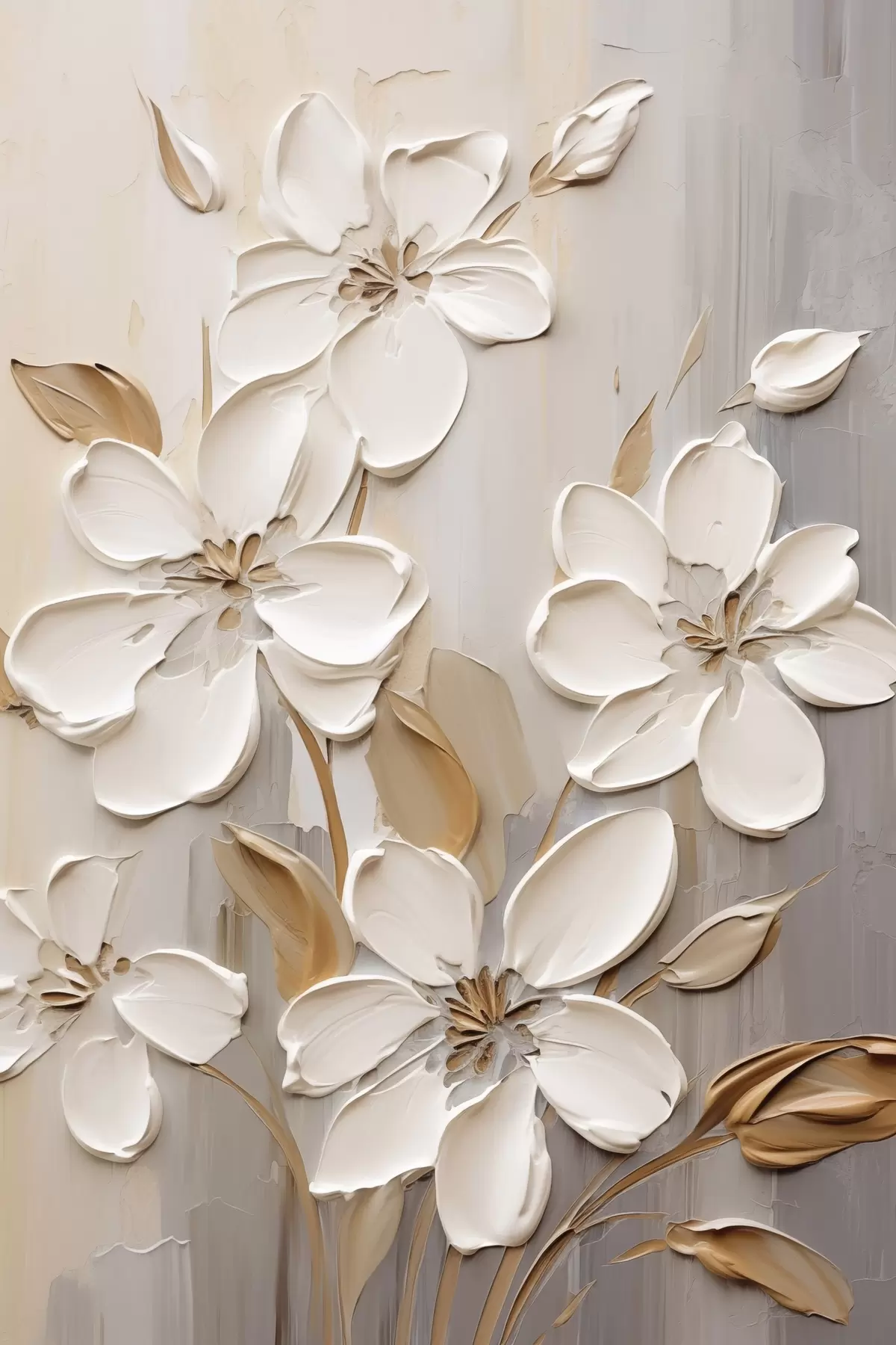 Poster Abstrakte weiße Blumen mit strukturierten Blütenblättern vor einem neutralen Hintergrund mit subtilen Pinselstrichen. f47874