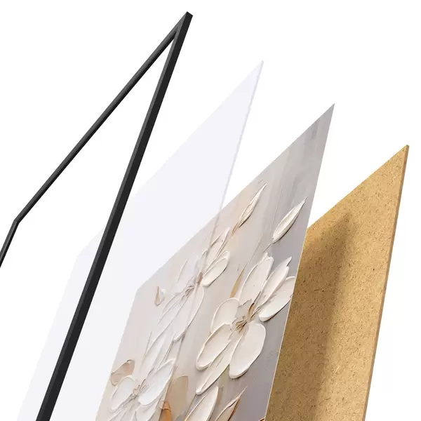 Das Poster besteht aus einem Rahmen, Plexiglas, einem gedruckten Bild und einer Rückwand aus Spanplatten. Dank der Halterungen auf der Rückseite kann das Poster sofort an die Wand gehängt werden.