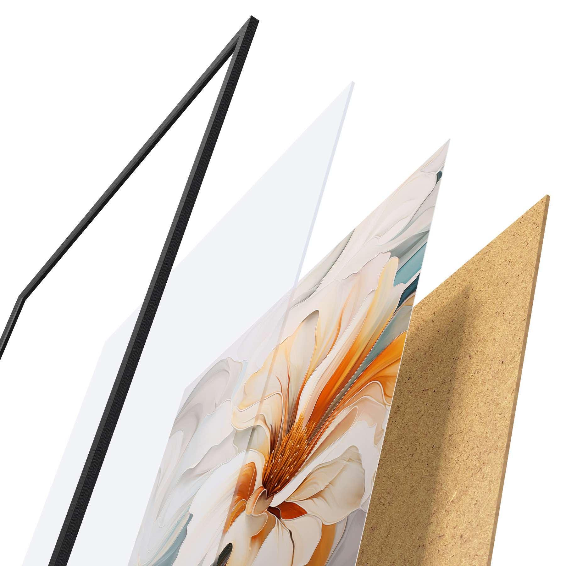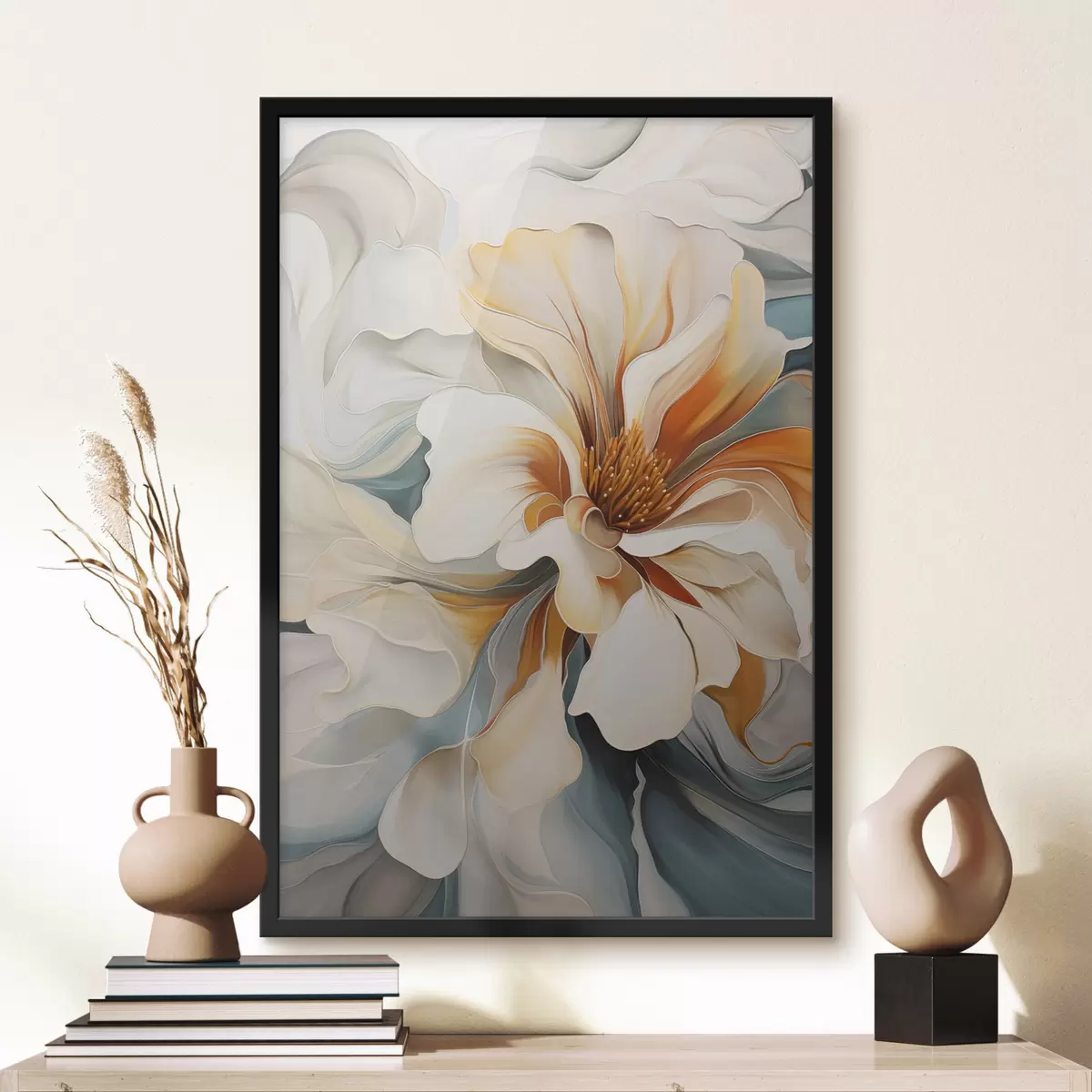 Poster Abstrakte große Blume mit weißen, orangefarbenen und blaugrünen Blütenblättern, strukturierter Hintergrund f47877
