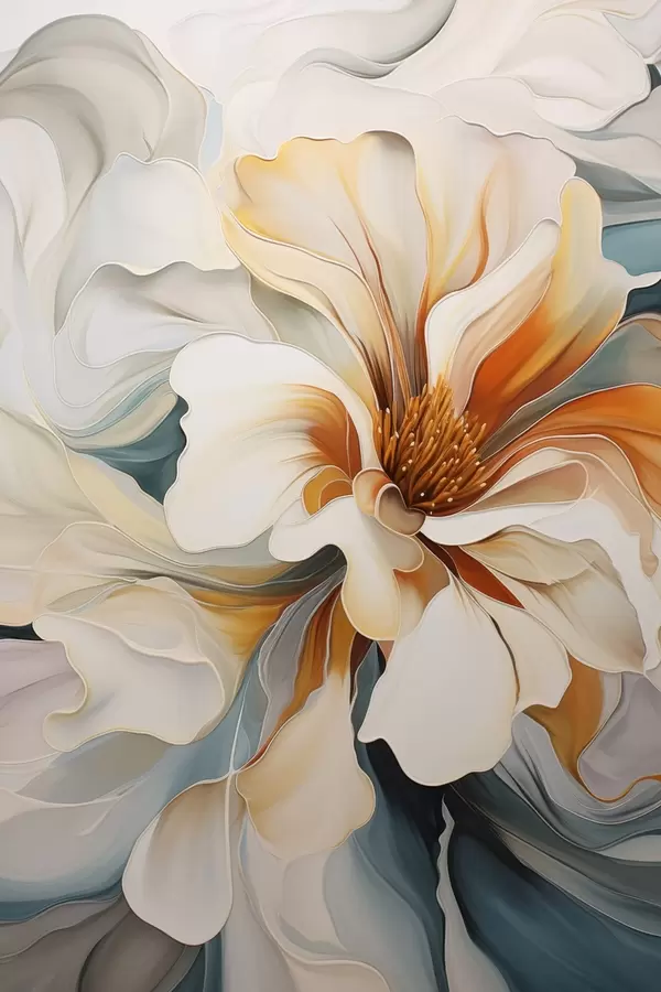 Poster Abstrakte große Blume mit weißen, orangefarbenen und blaugrünen Blütenblättern, strukturierter Hintergrund f47877