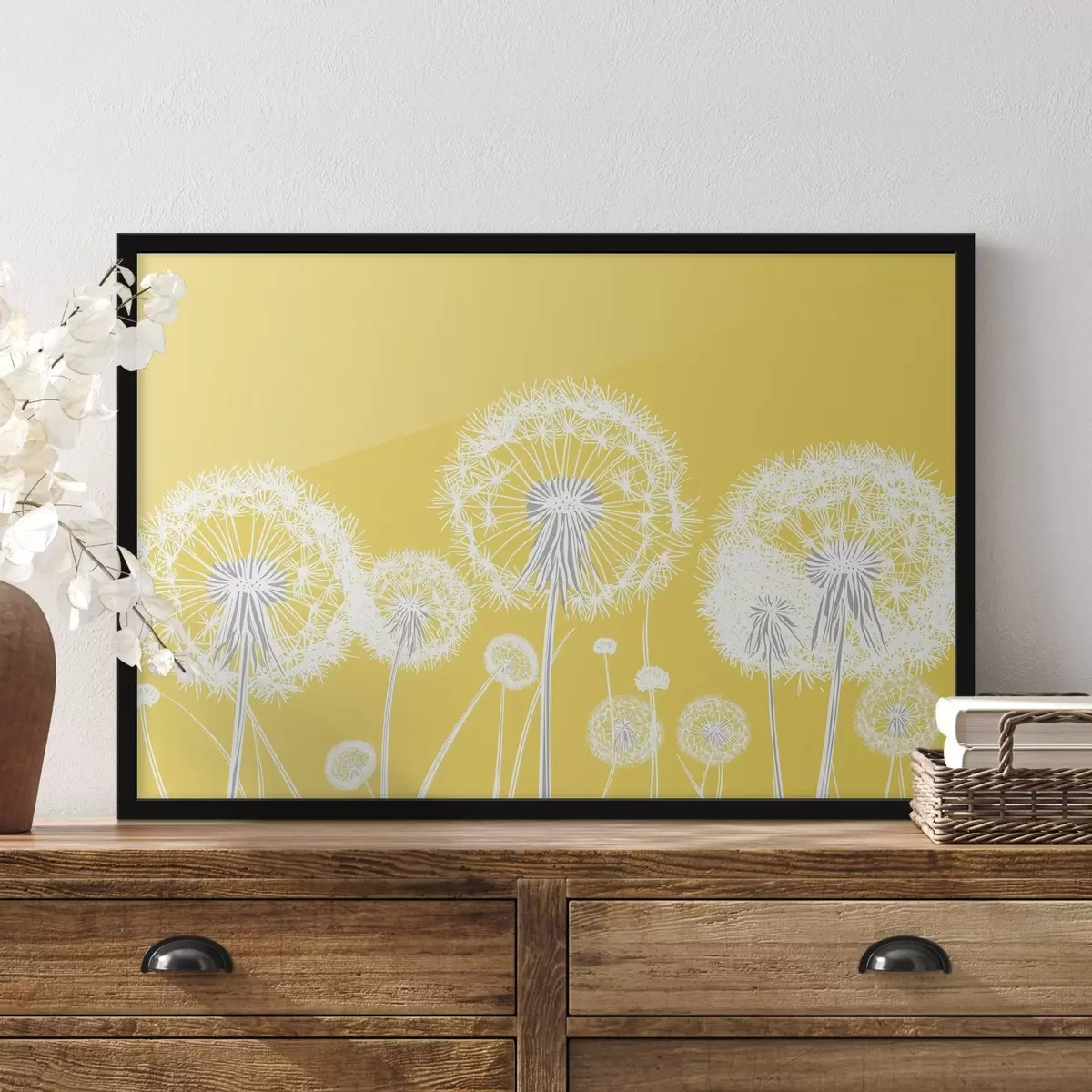 Poster Weiße Löwenzahnblüten auf gelbem Hintergrund f47890