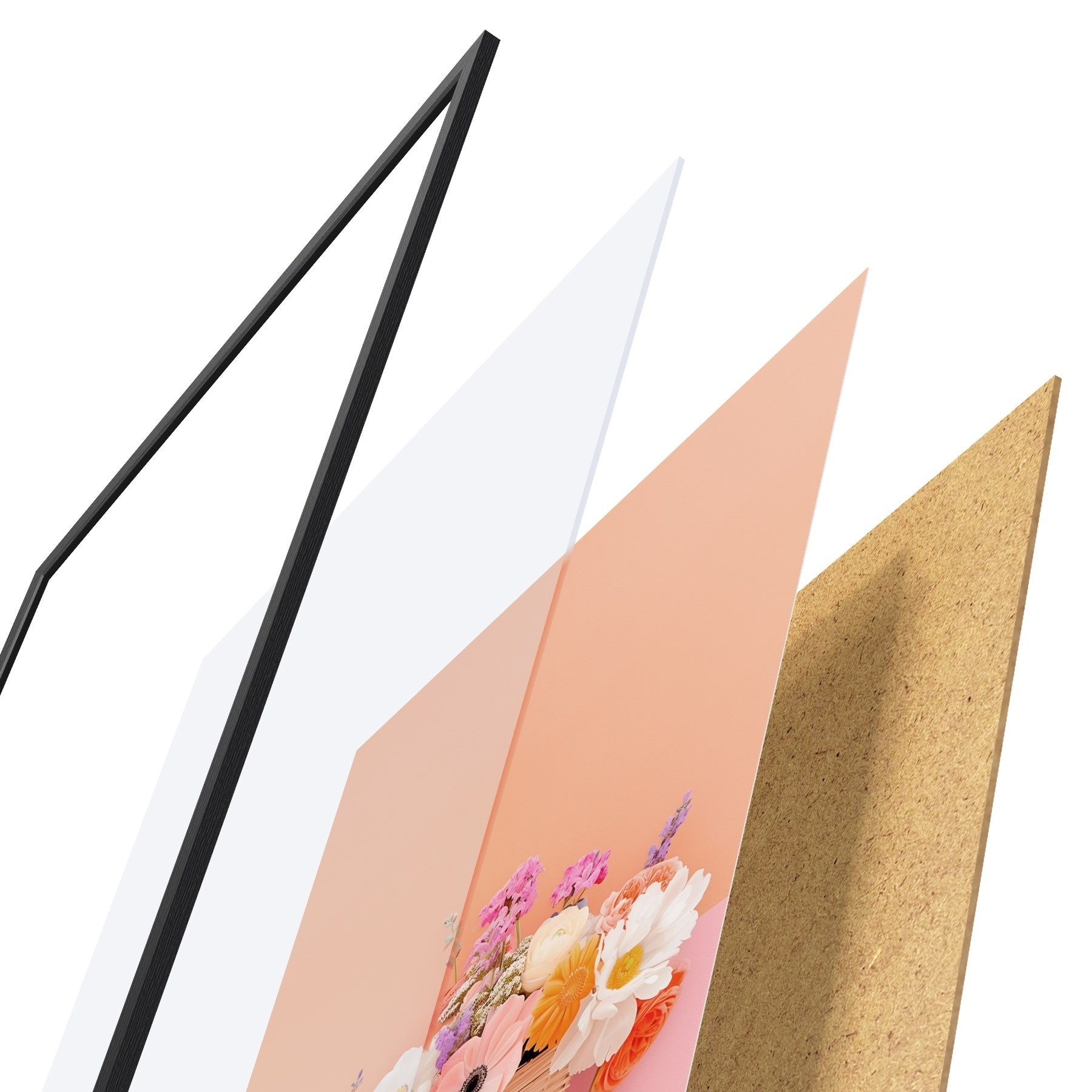 Das Poster besteht aus einem Rahmen, Plexiglas, einem gedruckten Bild und einer Rückwand aus Spanplatten. Dank der Halterungen auf der Rückseite kann das Poster sofort an die Wand gehängt werden.