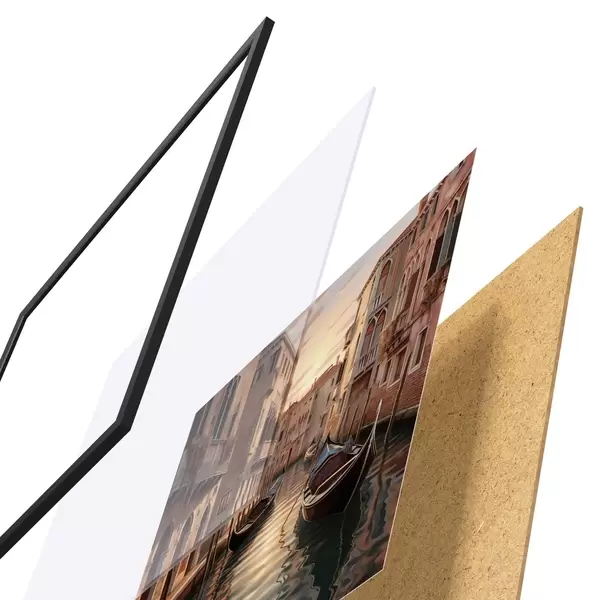 Das Poster besteht aus einem Rahmen, Plexiglas, einem gedruckten Bild und einer Rückwand aus Spanplatten. Dank der Halterungen auf der Rückseite kann das Poster sofort an die Wand gehängt werden.
