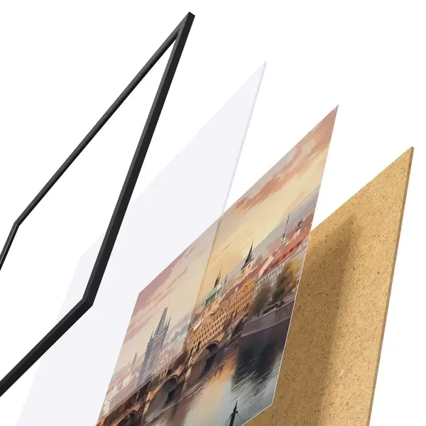 Das Poster besteht aus einem Rahmen, Plexiglas, einem gedruckten Bild und einer Rückwand aus Spanplatten. Dank der Halterungen auf der Rückseite kann das Poster sofort an die Wand gehängt werden.