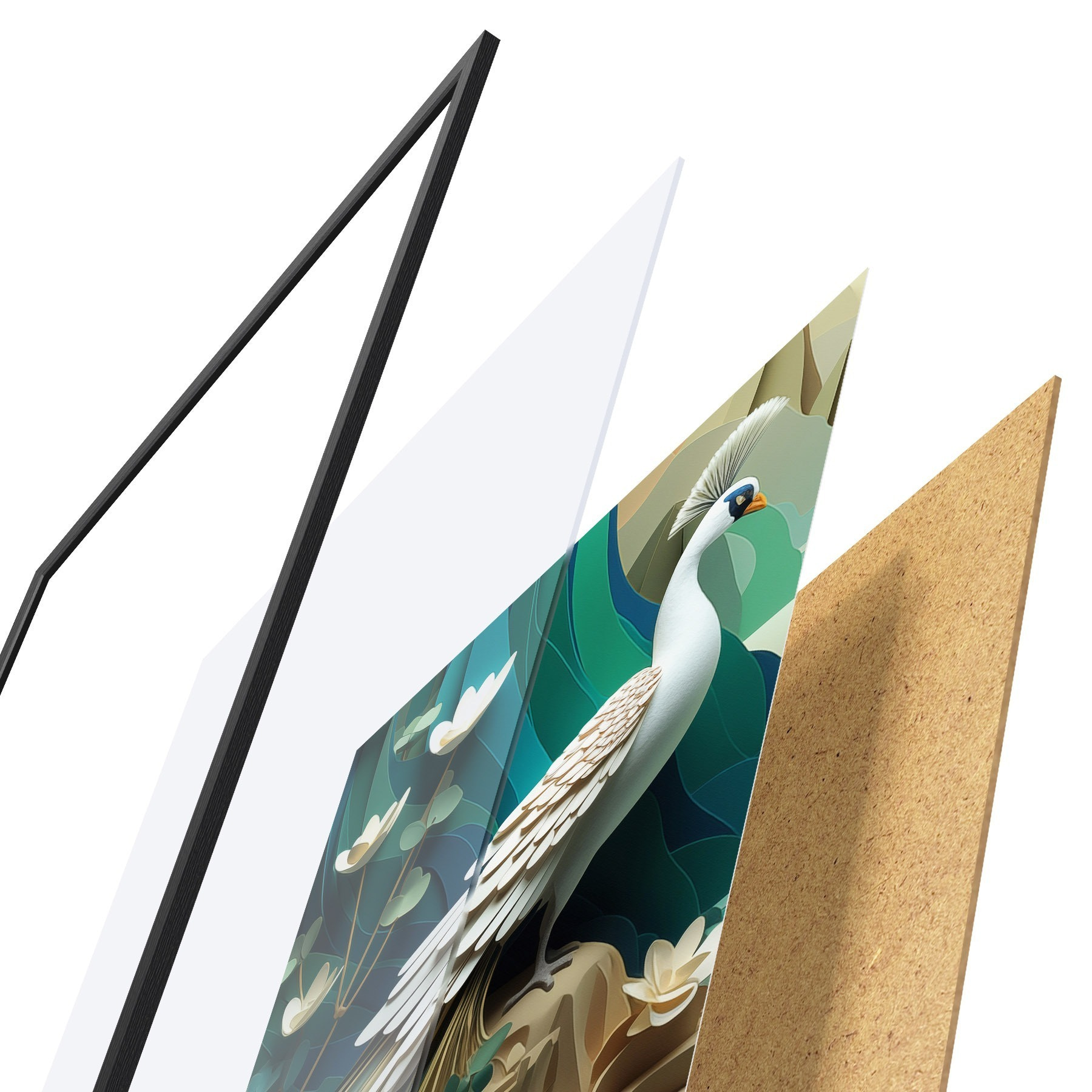 Das Poster besteht aus einem Rahmen, Plexiglas, einem gedruckten Bild und einer Rückwand aus Spanplatten. Dank der Halterungen auf der Rückseite kann das Poster sofort an die Wand gehängt werden.