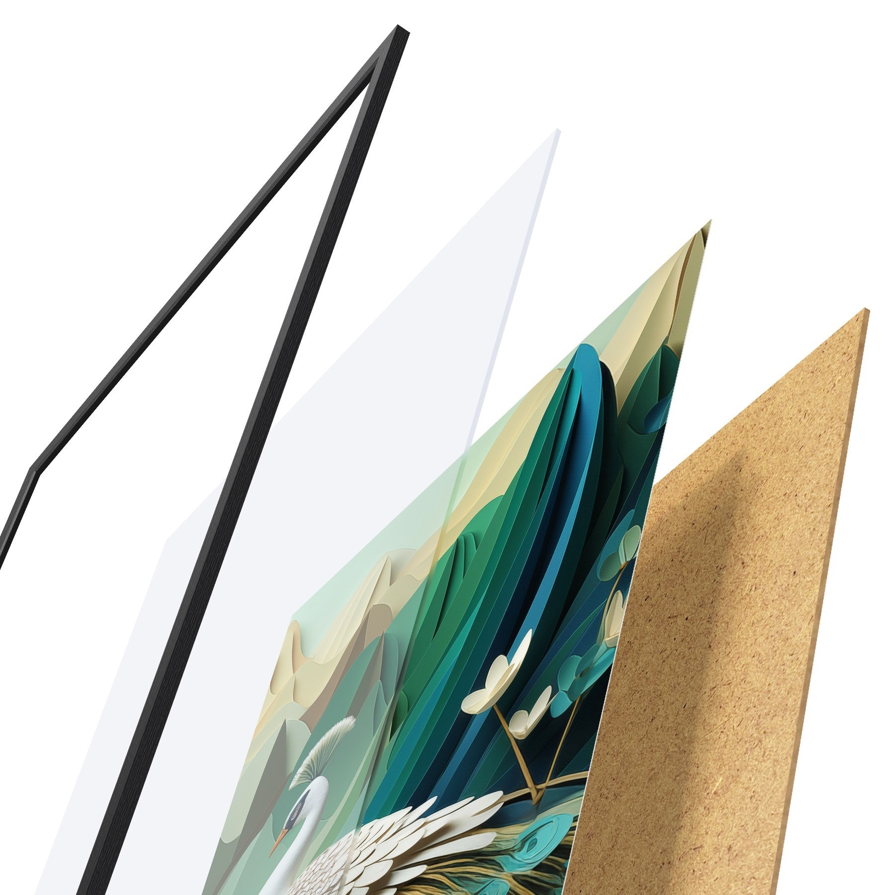 Das Poster besteht aus einem Rahmen, Plexiglas, einem gedruckten Bild und einer Rückwand aus Spanplatten. Dank der Halterungen auf der Rückseite kann das Poster sofort an die Wand gehängt werden.