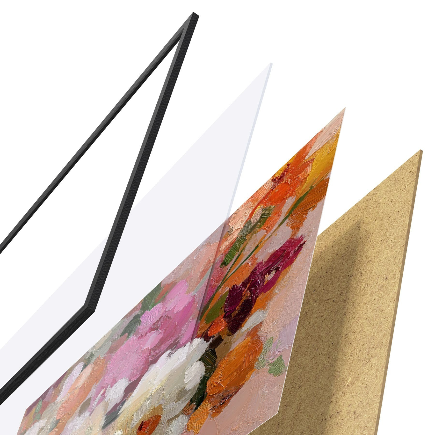 Das Poster besteht aus einem Rahmen, Plexiglas, einem gedruckten Bild und einer Rückwand aus Spanplatten. Dank der Halterungen auf der Rückseite kann das Poster sofort an die Wand gehängt werden.