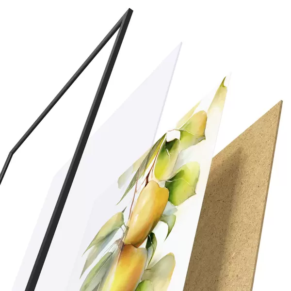 Das Poster besteht aus einem Rahmen, Plexiglas, einem gedruckten Bild und einer Rückwand aus Spanplatten. Dank der Halterungen auf der Rückseite kann das Poster sofort an die Wand gehängt werden.