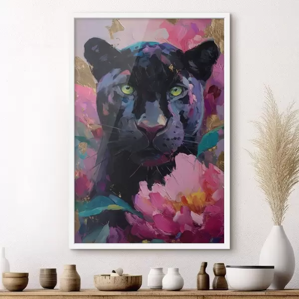 Poster Schwarzer Panther zwischen Pfingstrosen f47935