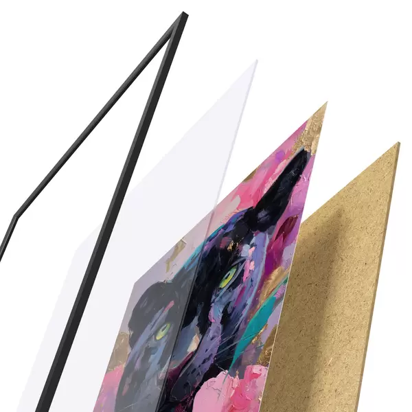 Das Poster besteht aus einem Rahmen, Plexiglas, einem gedruckten Bild und einer Rückwand aus Spanplatten. Dank der Halterungen auf der Rückseite kann das Poster sofort an die Wand gehängt werden.