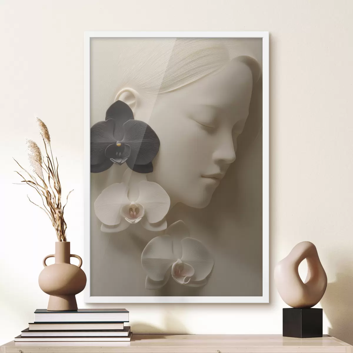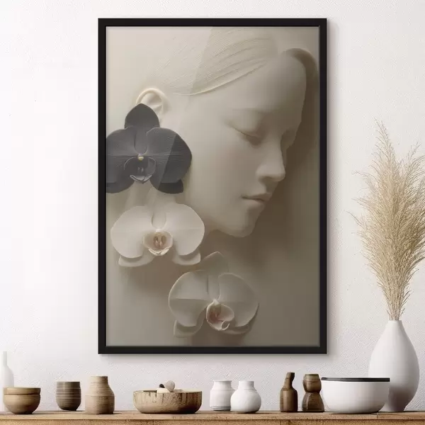 Poster Mädchen mit Orchideen im Flachreliefstil f47941