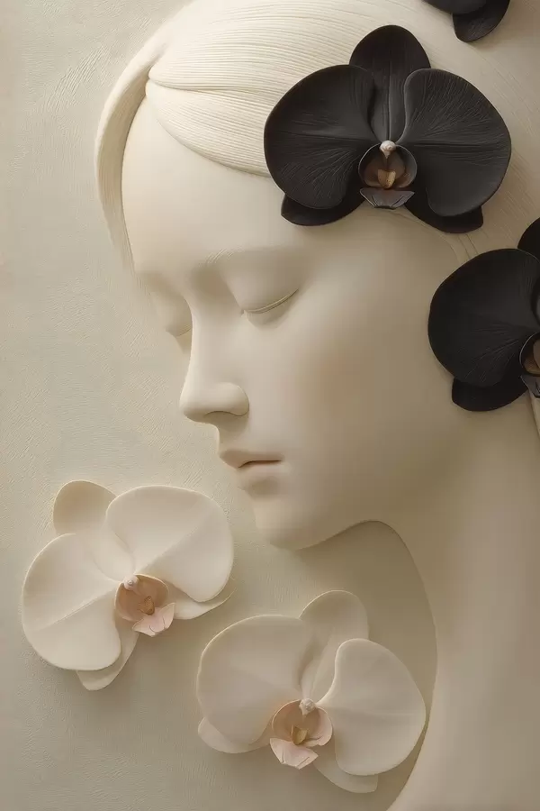 Poster Mädchen mit Orchideen im Flachreliefstil f47942