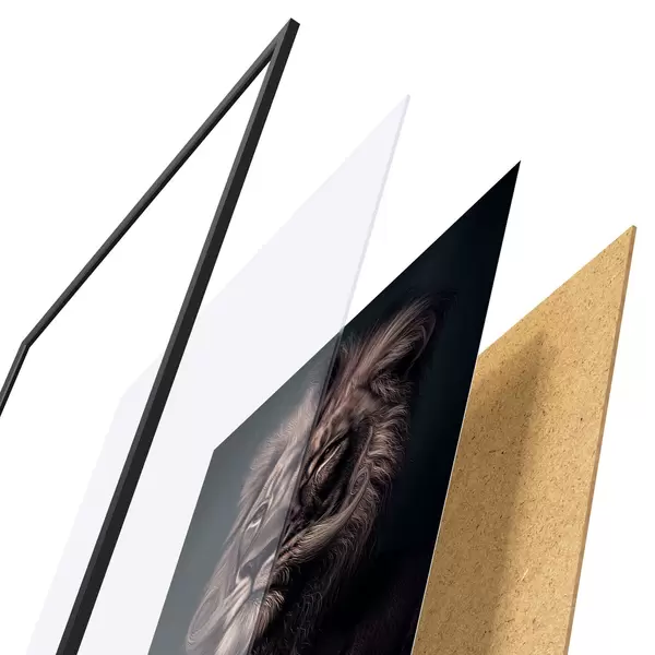 Das Poster besteht aus einem Rahmen, Plexiglas, einem gedruckten Bild und einer Rückwand aus Spanplatten. Dank der Halterungen auf der Rückseite kann das Poster sofort an die Wand gehängt werden.