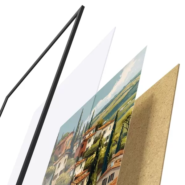 Das Poster besteht aus einem Rahmen, Plexiglas, einem gedruckten Bild und einer Rückwand aus Spanplatten. Dank der Halterungen auf der Rückseite kann das Poster sofort an die Wand gehängt werden.