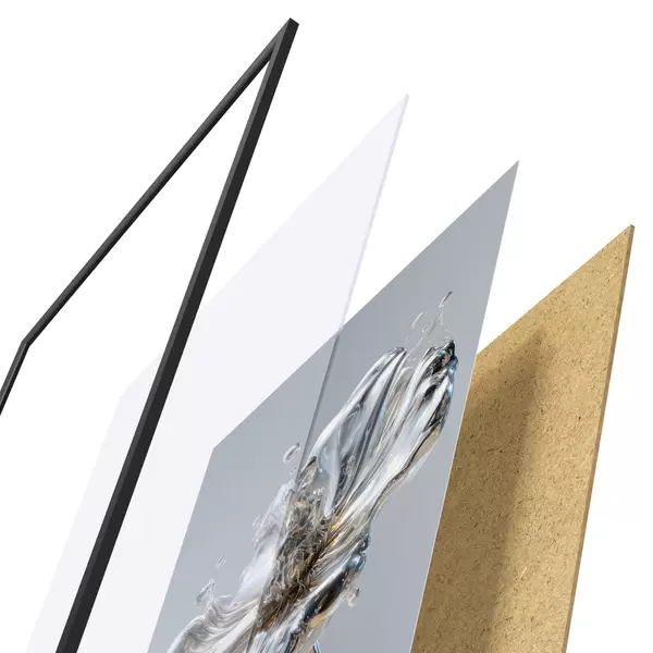 Das Poster besteht aus einem Rahmen, Plexiglas, einem gedruckten Bild und einer Rückwand aus Spanplatten. Dank der Halterungen auf der Rückseite kann das Poster sofort an die Wand gehängt werden.