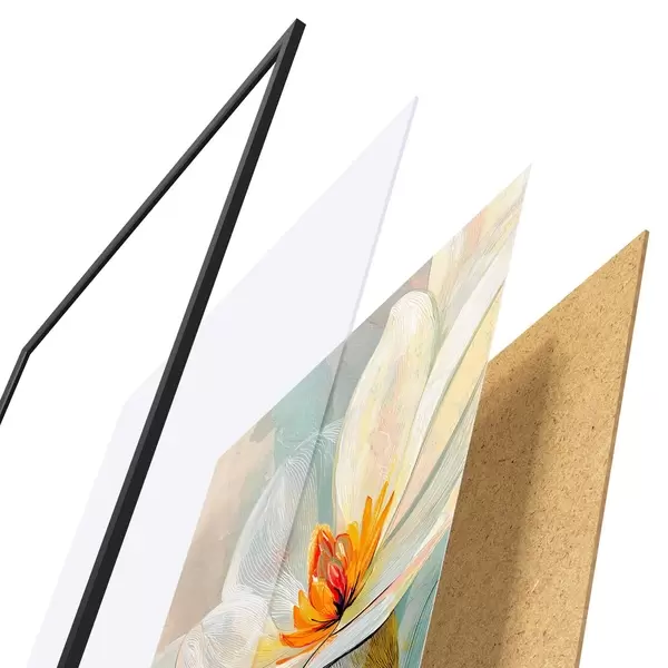 Das Poster besteht aus einem Rahmen, Plexiglas, einem gedruckten Bild und einer Rückwand aus Spanplatten. Dank der Halterungen auf der Rückseite kann das Poster sofort an die Wand gehängt werden.