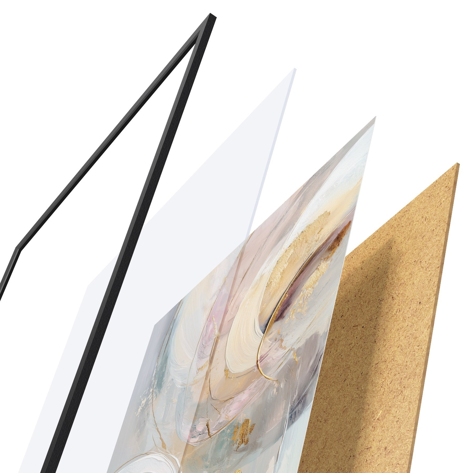 Das Poster besteht aus einem Rahmen, Plexiglas, einem gedruckten Bild und einer Rückwand aus Spanplatten. Dank der Halterungen auf der Rückseite kann das Poster sofort an die Wand gehängt werden.