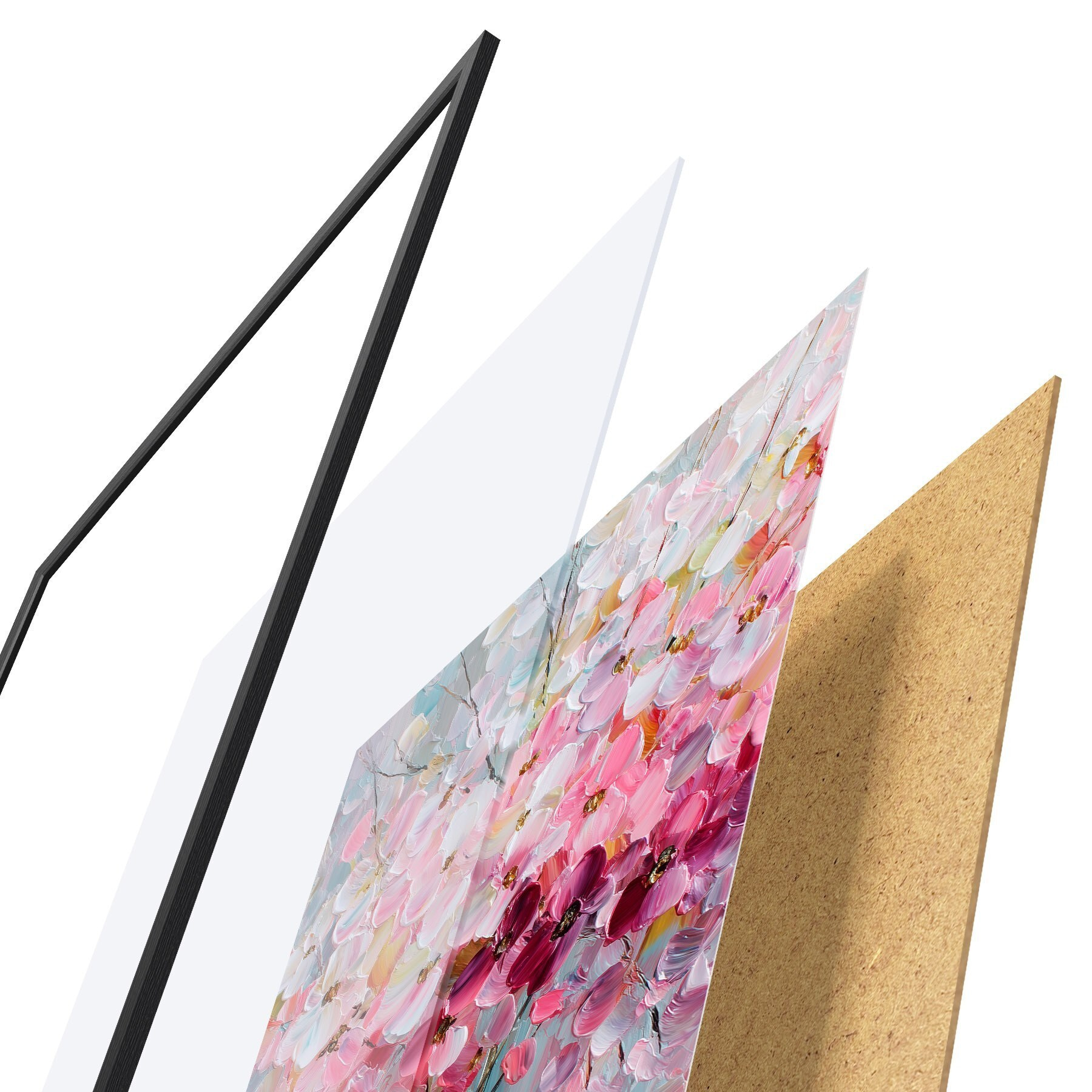 Das Poster besteht aus einem Rahmen, Plexiglas, einem gedruckten Bild und einer Rückwand aus Spanplatten. Dank der Halterungen auf der Rückseite kann das Poster sofort an die Wand gehängt werden.