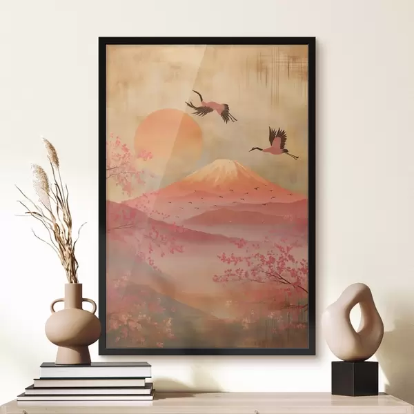 Poster Kräne vor der Sonne und den Bergen: Illustration im digitalen Kunststil Nr f47992