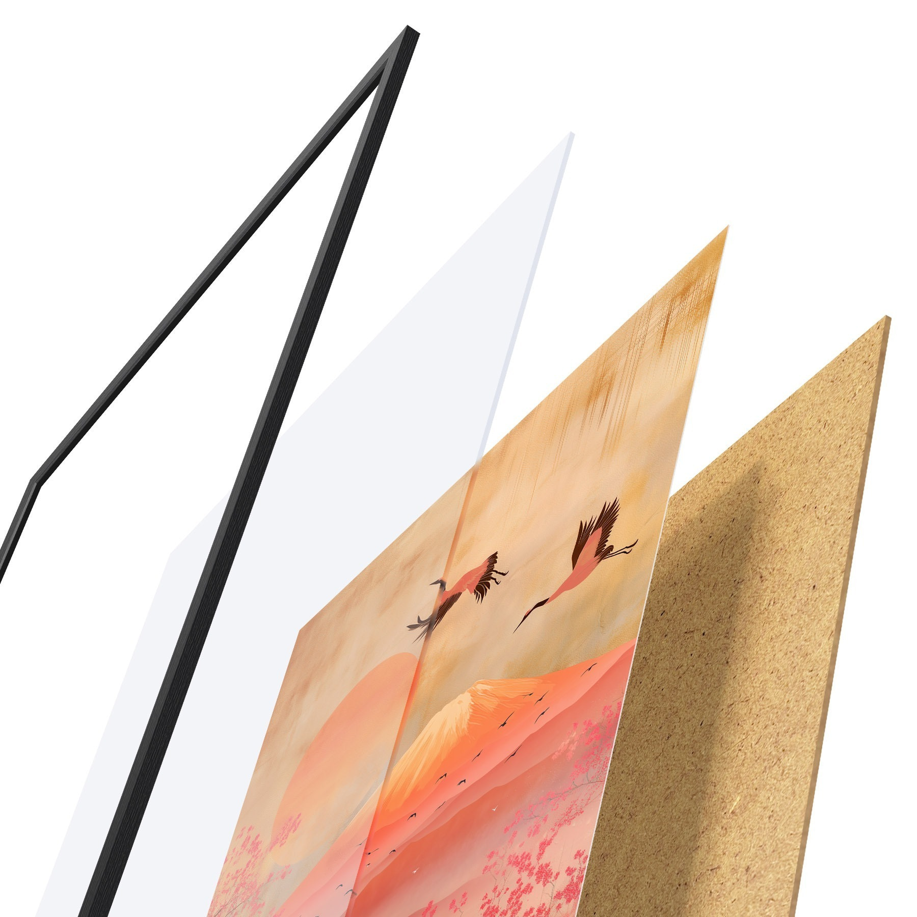 Das Poster besteht aus einem Rahmen, Plexiglas, einem gedruckten Bild und einer Rückwand aus Spanplatten. Dank der Halterungen auf der Rückseite kann das Poster sofort an die Wand gehängt werden.